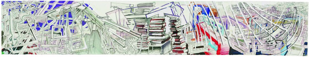 « Rouleau, 23 « 2019. Série « Rouleau » Collage sur Papier, image imprimée, peinture, crayon, marqueur, stylo à bille, 90 x 150 cm.